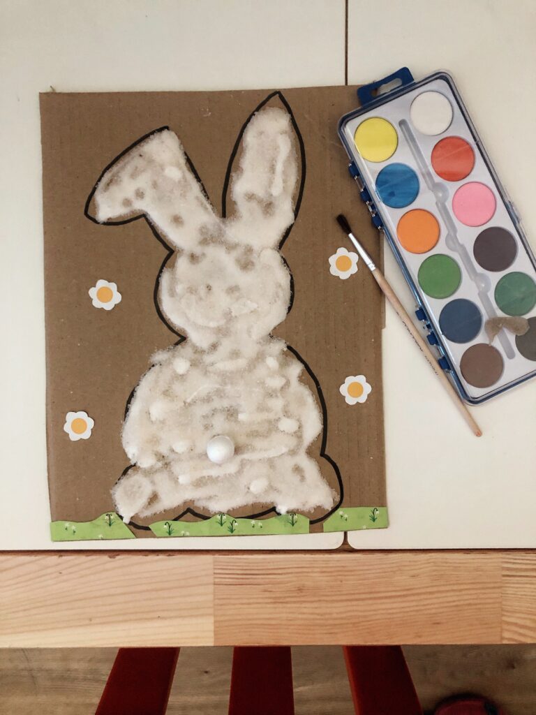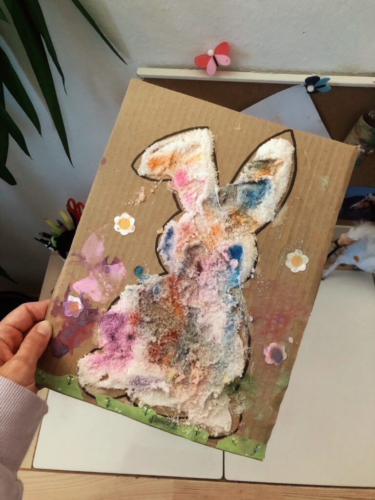 Na kus kartonu nakreslíme zajíčka (nebo jakýkoli jiný obrázek, žejo). Pokryjeme ho vrstvou tekutého lepidla, které následně zasypeme solí, skoro “do bezvědomí”. Necháme zaschnout a tadá. Už jen stačí to dítko, trpělivý, něžný, nepřipravený se přes kopce soli rozběhnout a prodrat k cíli, lepidlo, nelepidlo. Možná bude jen stačit dítko o kousek starší, než je to naše.