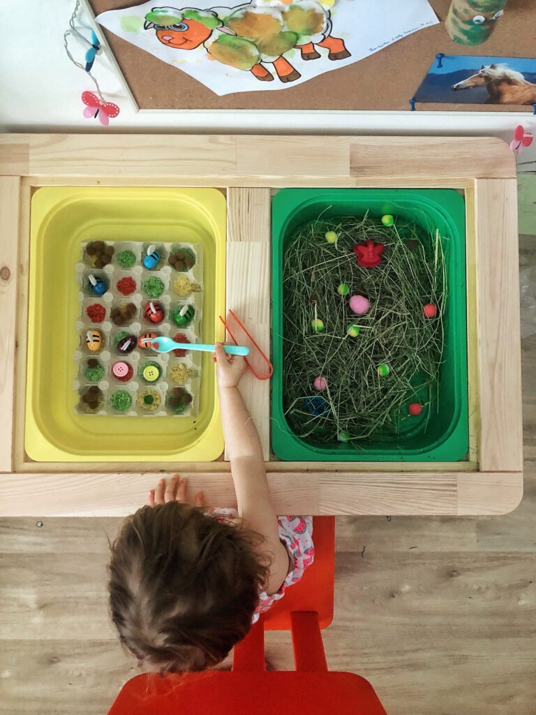 Potravinářským barvivem jsem večer před obarvila rýži. Ráno ji rozdělila do políček plata od vajíček, nastrkala k ní včeličky, knoflíčky a chlupatý bambulky. Do boxíku hned naproti jsem napěchovala ukradené seno, od té naší delegace morčat, ledabyle na něj poházela další chlupaté bambulky a přidala dvě motýlí formičky. Naše holčička si to navrch obohatila o lžíci a jednu mega pinzetu. Takový malinký úl naproti malinkýho pole.