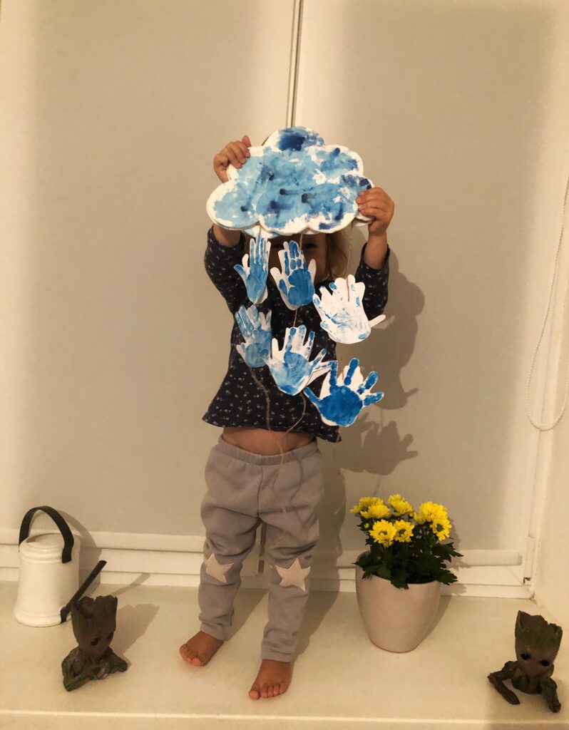 Teď už potřebujeme jen ty šikovný, dětský ručičky. Mráček pokapou, vybarví, otisky vyrobí a na maminky zbude kapičky zavěsit. Já na zavěšení kapek použila lýkový provázek.