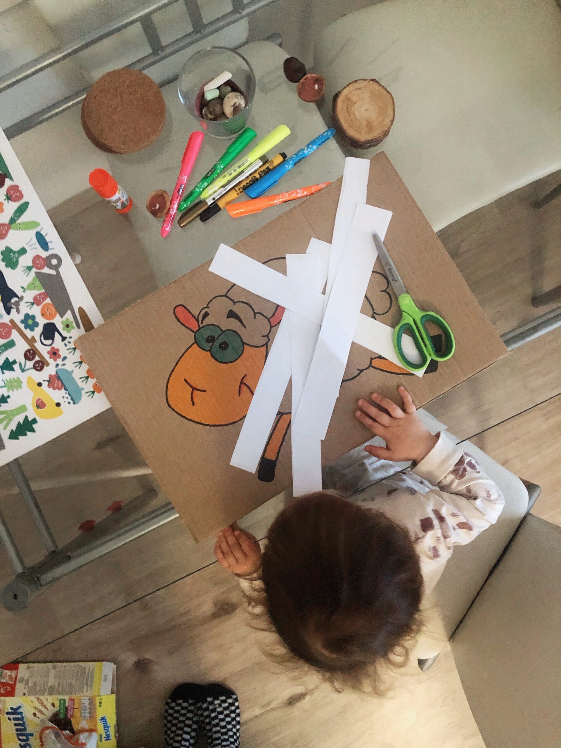 Na kus zmíněného kartonu jsem nakreslila ovečku, jak tematické, že? Až po zhotovení mě napadlo ostříhat třeba psa, nebo kočku. Každopádně, my už musíme bojovat s další ovcí na place, tak žádný jakýpak copak. Následně jsem ji tedy “vybarvila” a oblepila zvlněnými proužky bílého papíru, jakožto ovčích kudrlinek. Na výrobu loken nezbedných jsem použila nůžky, jako kdysi, na základce. Teď už stačí dětské ručičky s nůžkami, aby je všechny z ovce dostaly zase dolů.
