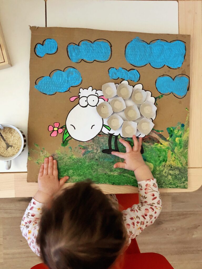 Ovečku jsem “vybarvila”, nalepila na karton, již předem ozdobený ručičkama naši holčičky. Nakreslila obláčky, to ale jen proto, abych zamaskovala nejhorší fleky po kartonu. Potom už jsem jenom dolepila vystřižená plata od vajíček, nasypala rýži do hrnečku a nacpala lžičku do ručičky paní Sypalové.