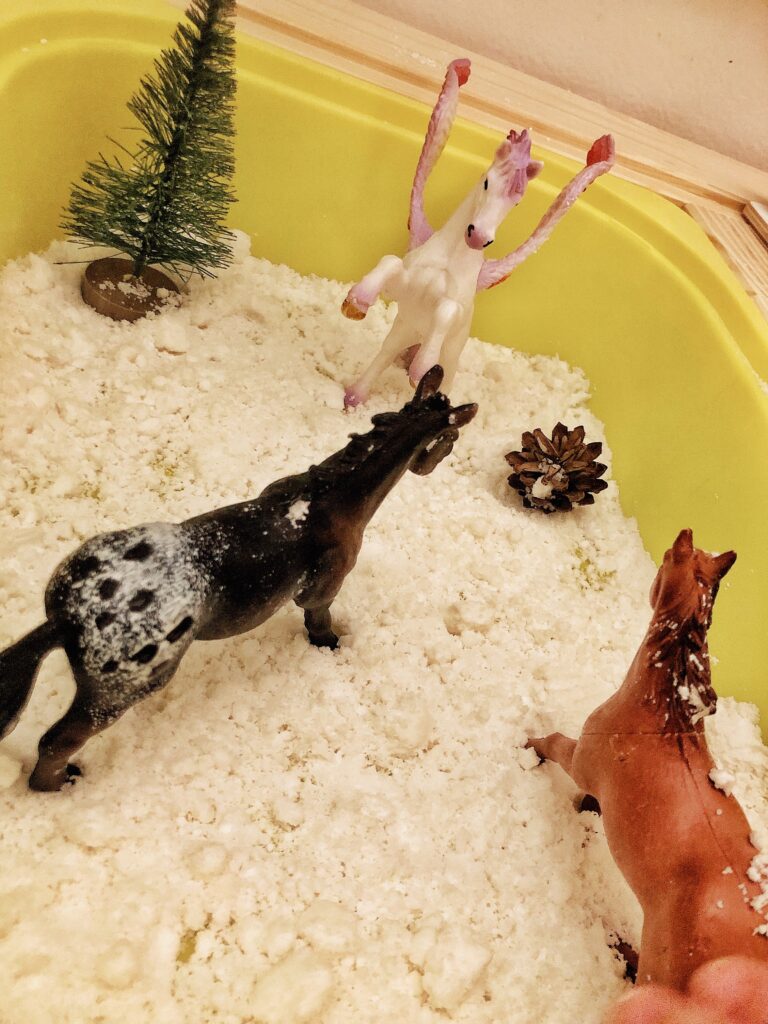 Když ojedete internety, najdete návodů, až Vám oči budou přecházet. On se ten sníh dá vytvořit snad za jakýkoli situace. Třeba z dětský pleny s vodou, kterou mi doma ale nevedeme -plenu, voda nám teče, čestný. Tak jsem musela hledat dál. Oblíbenou variantou je škrob a pěna na holení. Teď se trochu ušklíbneme, ani to doma prostě nevedu. Varianta s číslem tři už byla slibnější a to, prosím pěkně, ze sody a vlasového kondicionéru. Ten mi tady zůstal, kousek, z bůh ví kterého stěhování, ale zůstal. Tak jsme stvořily náš první. umělý, domácí sníh.