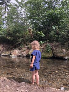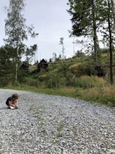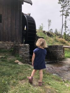 Po tom co naše holčička uznala prohlídku za uzavřenou, mohli jsme si dát hodinovou svačinu na hřišti a po neúnavném houpání a klouzání se uvolila přesunout k části druhé. Ke zhruba 400 metrů vzdáleným zlatorudným mlýnům a k tavící peci. Cesta to byla ovšem krkolomná, daleká. Kamínky totiž ještě stále nedají naši holčičce spát a její touha zjistit, kolik jich dokáže potůček spapat než se naplní, byla silnější než cokoli jiného v ten moment.